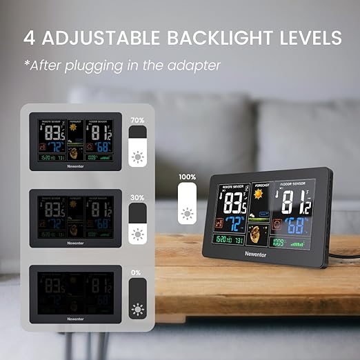 - [7.5" LCD Screen Weather Stations] Newentor temperature&humidity monitor with large color display, which shows comprehensive information: inside outside temperature humidity(max/min, hi/lo), customizable alerts, time/date, alarm clock/snooze, weather forecast (next 8-24 hrs) moon phase, barometric pressure.