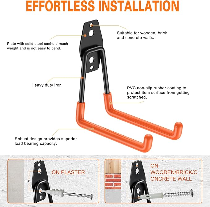 - Easy Installation: The garage hooks come with two types of screws, including 8 sets of screws and wall plugs, to accommodate different wall surfaces. Depending on your storage needs, you can install the garage wall hooks on brick/concrete/wood walls or drywall.