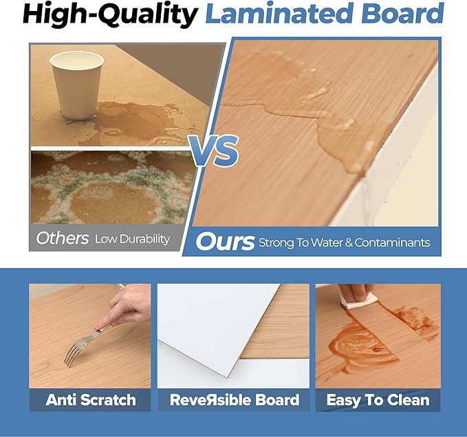 - Superior Upgrade Laminated Board - Say goodbye to worrying about water damage and humidity and flimsy shelves that warp or split. This is not only designed with a much thicker laminated board for durability to withstand water damage and can be used in areas with high humidity but also looks great and feels soft to the touch. Plus, it's easy to manage - if any contaminants get on the surface, simply remove them without any pesky stains or seepage.