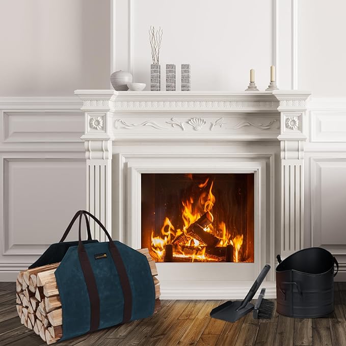 Sturdy Waxed Canvas Firewood Log Carrier, Durable Firepalce Wood Bag with Reinforce Duty Straps, BlueGreen