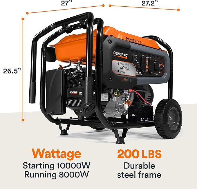 - Powerful Portable Performance: With Generac’s PowerRush Advanced Technology, the 7715 GP8000E generator delivers 40% more starting capacity, handling heavy electrical loads with ease. Ideal for emergency power, recreation, and home use