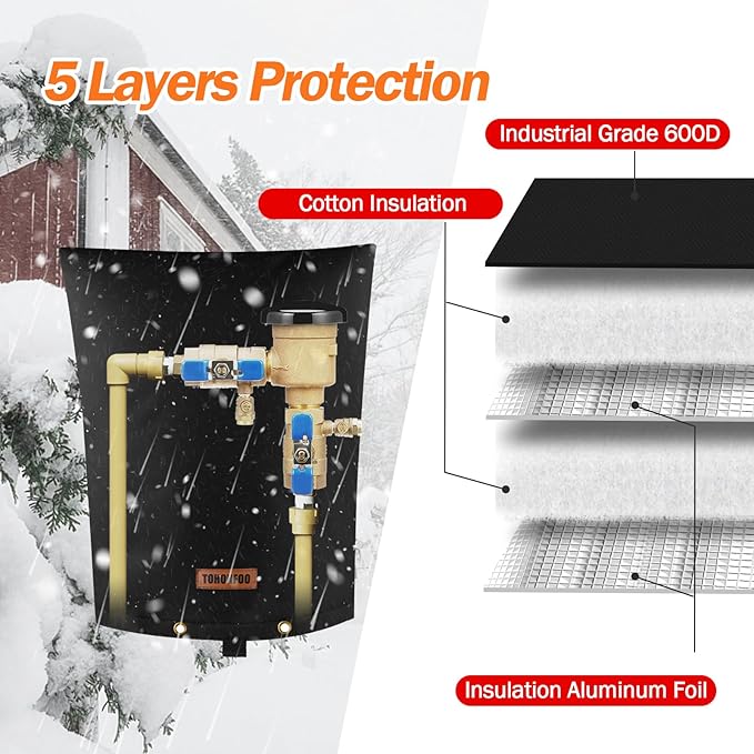 - 【Multipurpose】Our Pipe Insulation Cover works well as a Back Flow Preventer Cover, Sprinkler System Cover, Irrigation System Cover, Well Head Cover Vacuum Breaker Cover, Hose Bib Cover, Well Filter Cover, etc. Protect your device from Severe Snow and Intense Sun.