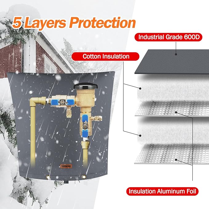 - 【5 Layers Design Insulation & Waterproof】Made of 1 Layer of Waterproof Heavy Duty 600D Oxford Fabric, 2 Layers of Cotton Insulation, and 2 Layers PE Sliver Coated Cloth that make it guard against severe weather. Our sprinkler cover for outside is engineered to endure freezing temperatures as low as 5 degrees. We recommend draining the system to winterize or prevent unknown cold weather.