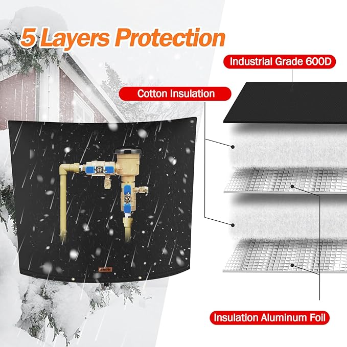 - 【Multipurpose】Our Pipe Insulation Cover works well as a Back Flow Preventer Cover, Sprinkler System Cover, Irrigation System Cover, Well Head Cover Vacuum Breaker Cover, Hose Bib Cover, Well Filter Cover, etc. Protect your device from Severe Snow and Intense Sun.