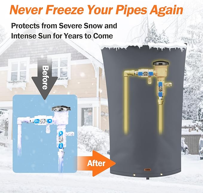 - 【Multipurpose】Our Pipe Insulation Cover works well as a Back Flow Preventer Cover, Sprinkler System Cover, Irrigation System Cover, Well Head Cover Vacuum Breaker Cover, Hose Bib Cover, Well Filter Cover, etc. Protect your device from Severe Snow and Intense Sun.