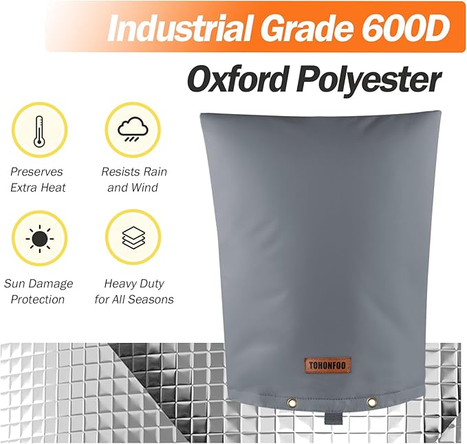 - 【5 Layers Design Insulation & Waterproof】Made of 1 Layer of Waterproof Heavy Duty 600D Oxford Fabric, 2 Layers of Cotton Insulation, and 2 Layers PE Sliver Coated Cloth that make it guard against severe weather. Our sprinkler cover for outside is engineered to endure freezing temperatures as low as 5 degrees. We recommend draining the system to winterize or prevent unknown cold weather.
