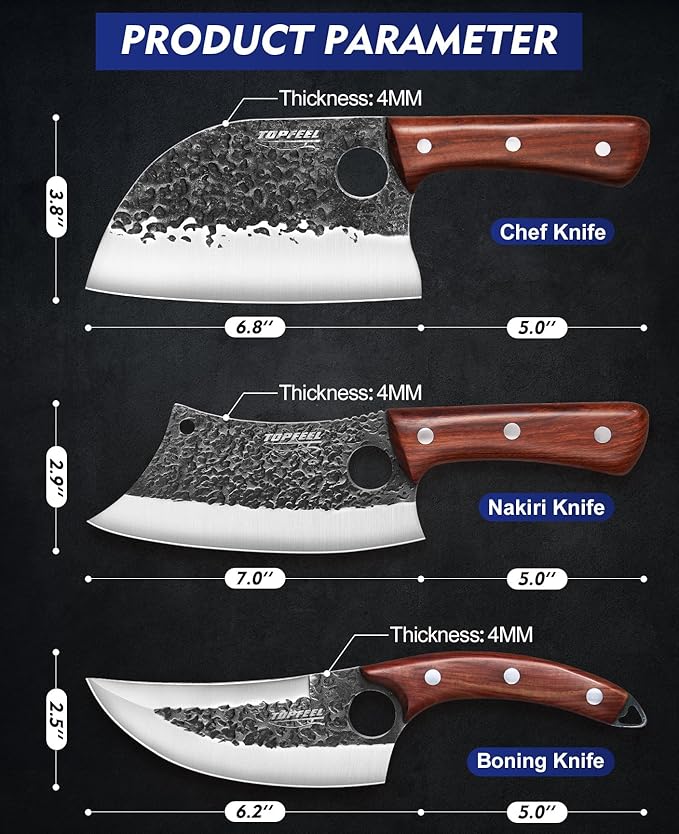 - 【Hand Forged Meat Cleaver】 These forged butcher knives are hand forged by craftsmen with more than 50 years of experience. Crafted from high carbon steel, our durable viking knife set boasts incredibly sharp blades. The chopping knife can be keeped the blade sharp for a long time, helping you cut food effortlessly. The oxidation blackening and hammering process add an anti-stick effect, enhancing the knife's technical and aesthetic appeal. Warm Tip: Always Handwashing it!