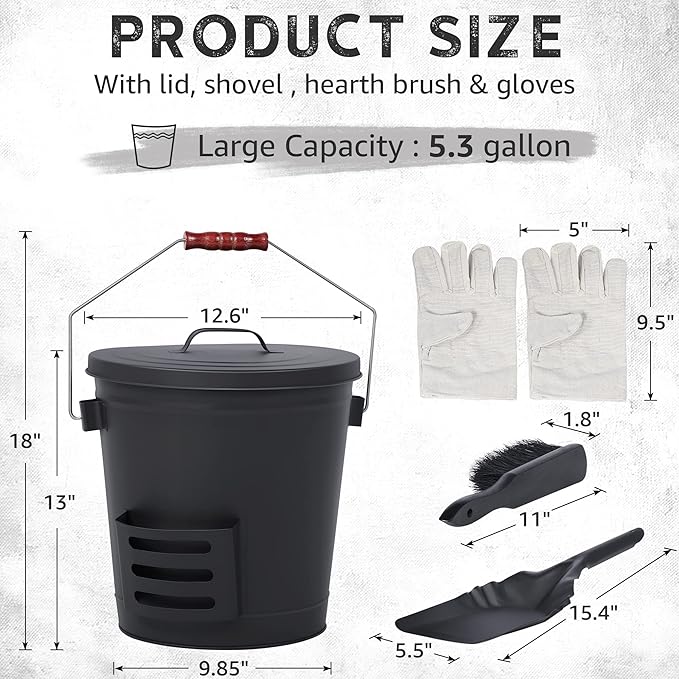 - 【5.3 GALLON LARGE FIREPLACE BUCKET】Hold a good amount of ashes that fit for any fireplace, use it to carry or store and clean up ash, coals, pellets, charcoal, embers, fire glass, etc.Measures 13''H x 9.8'' base diameter, by 12.6 top diameter, looks great both empty and in use and is a valuable addition to your set of fireside tools.