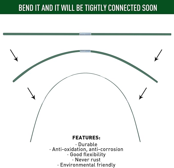 - 【JUST BEND IT】Connect the rods with the connectors. Bend the hoops, and they magically connect tightly. Insert them into the soil, and you'll find that these parts can be reused season after season.