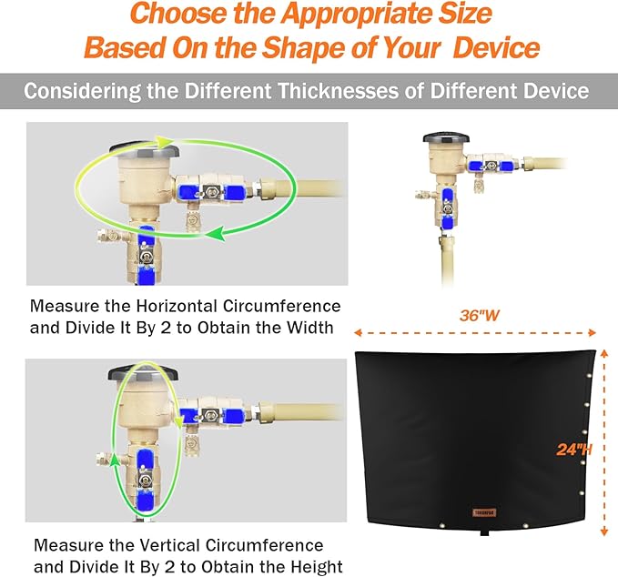 - 【Measure Before Purchase】The size of this sprinkler backflow cover for winter is 36"W x 24"H. Considering the Different Thicknesses of Different Equipment, measure the Horizontal Circumference and Divide It By 2 to Obtain the Width, and measure the Vertical Circumference and Divide It By 2 to Obtain the Height. Choose the appropriate size based on your device.