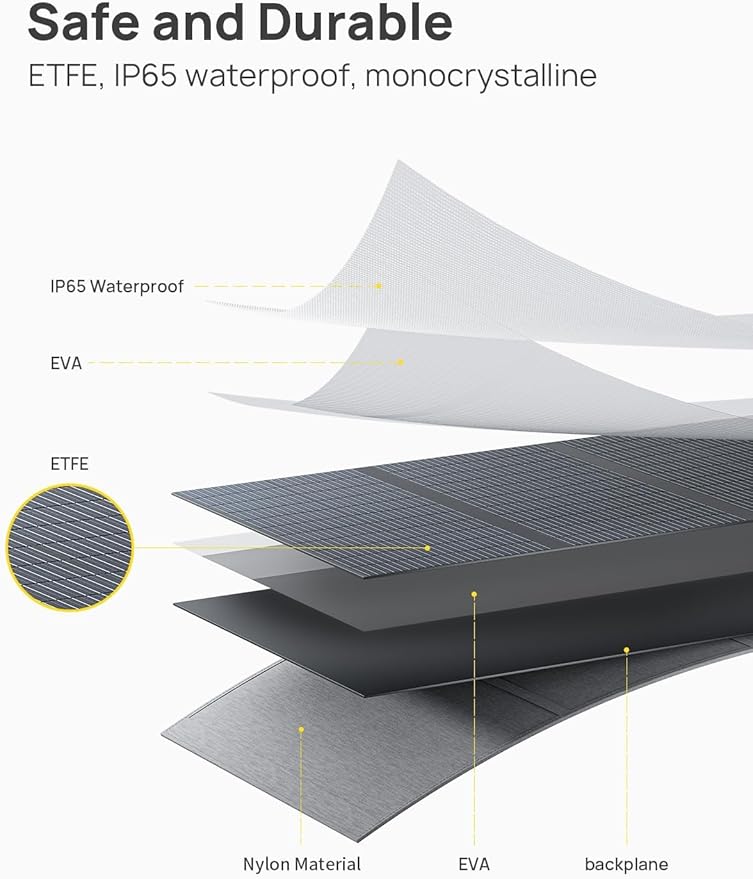 - 【High-Performance Solar Panel】It adopts industrial-grade monocrystalline silicon with a maximum sunlight conversion efficiency of 23%. The ETFE high-transparency encapsulation film has excellent light transmittance, is wear-resistant and lightweight, and the overall weight is only 9.9 pounds.