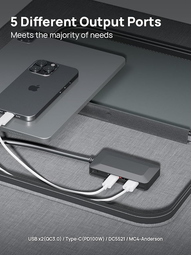 - 【AFERIY 200W Solar Panel】It can support a DC output of up to 22V/9A, with a power of up to 200W. There are five output interfaces:USB*2(QC3.0),Type-C*1(PD100W),DC5521*1,MC4-Anderson*1