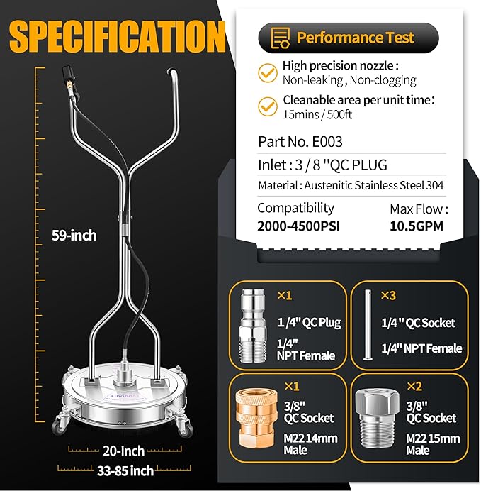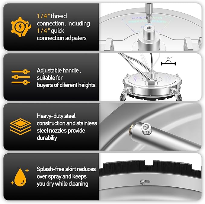 - PREMIUM QUALITY – Built with durable stainless-steel and a heavy-duty bearing for lasting performance; the splash-free skirt minimizes overspray to keep you dry. Features an adjustable handle and 4 smooth-gliding castors for effortless control, saving time and energy during operation.