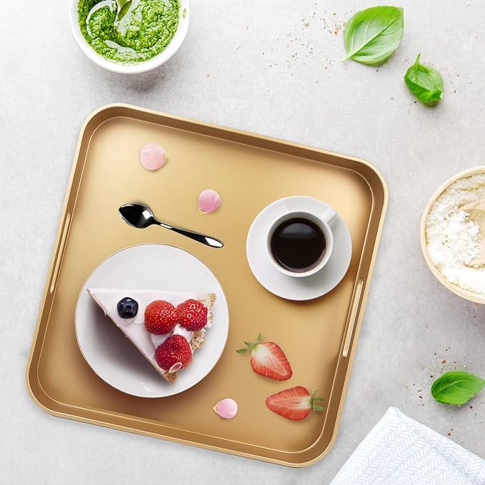 Square Gold Decorative Serving Tray with Handles, Versatile Ottoman Tray for Coffee Table, Entertaining, Outdoor Patio, Living Room, 13”*13”*1.6”