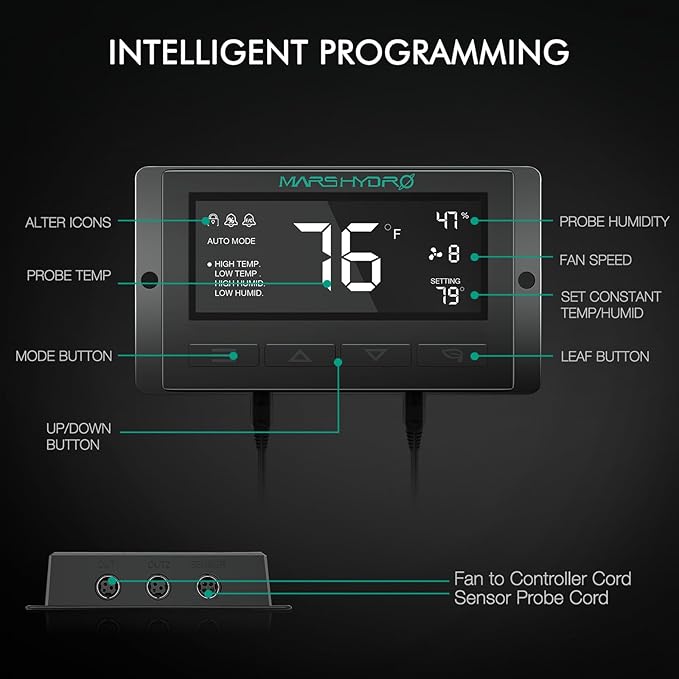 - 【Customize Temperature&Humidity】The inline fan is equipped with a customized intelligent controller that allows programmable control over temperature and humidity, fan speed, timing, and alarm systems.After customizing the temperature and humidity, the ventilation system will intelligently and automatically ventilate to adjust the temperature and humidity inside the tent.