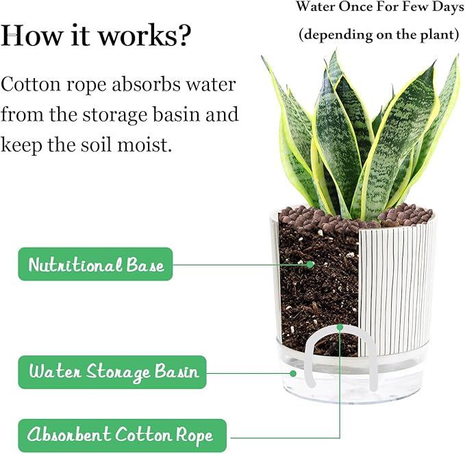 - Self-watering: The plant pots can store water for period after a single watering (depending on the plant ) and provide nutrients to your plants. It typically utilizing a white cotton rope to absorb water and ensure that the plants receive the necessary moisture.