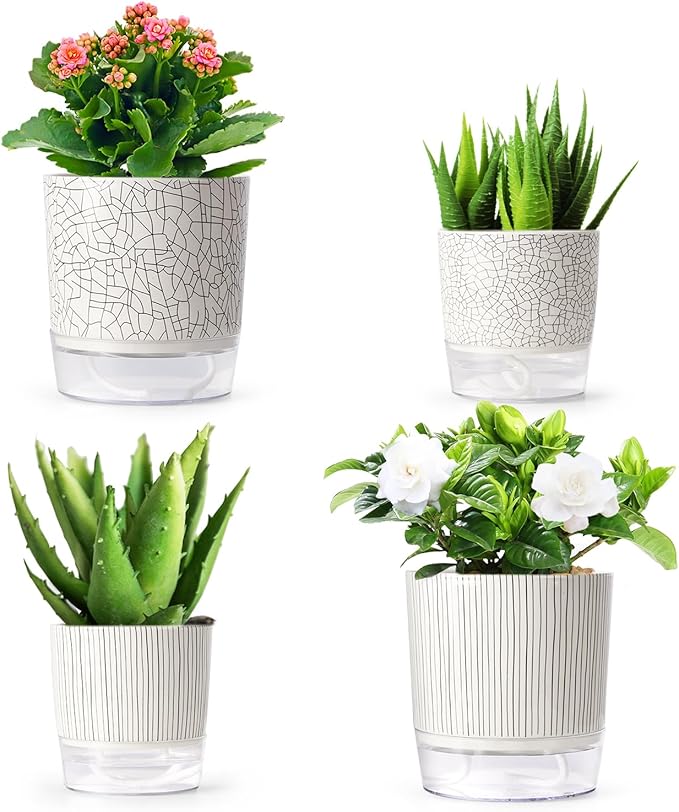 - Appropriate size :Our Self Watering Plant Pot set includes 2pc of 4inch and 2pcs of 5.3inch Self Watering Planter. These little flower pots are versatile and suitable for planting various types of indoor or outdoor plants such as orchids, cacti, aloe vera, Peace Lily, ZZ Plants, Succulent, etc.. Please note that the set only includes the flower pots, and plants are not included.