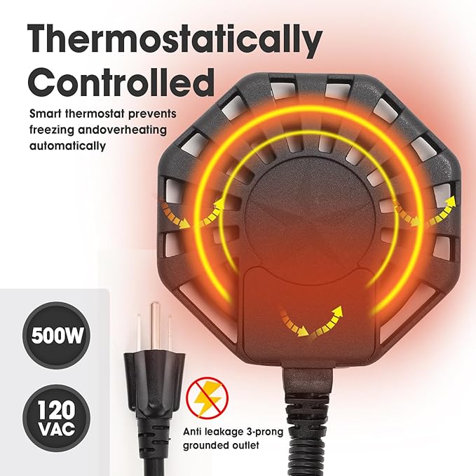 - Intelligent Thermostat Control:500-Watt DE-icer can automatically start or stop working according to the water temperature Save on electricity cost and provide the right drinking water temperature for both livestock and wildlife with this thermostatically controlled de-icer,Prevent water from freezing in cold winter automatilcally