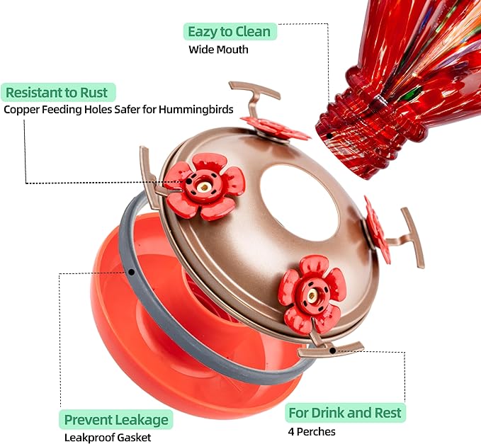 - 【Leakproof and SAFER Feeder Ports】The metal base is equipped with sealing ring and plastic basin for leakproof. UPGRADED feeder ports are made with premium copper materials, no sharp edges will cut or catch the hummingbirds' tongue. Make sure the gasket is securely attached before you hanging the hummingbird feeders outside.