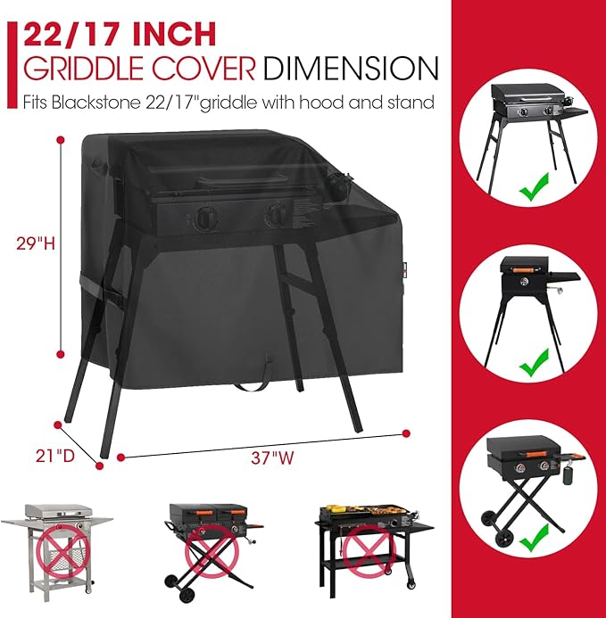 - 22 17 Inch Griddle Cover Dimension: Measures 37"W x 21"D x 29"H, compatible with Blackstone 22"/17" Griddles with Hood and Stand(Model 1891, 1939, 1935) and most grills/griddles with similar sizes. Not fit Blackstone 22" Pro Series Griddle, On The Go Tailgater 17" Griddle Combo, Duo 17" Griddle and Charcoal Grill Combo