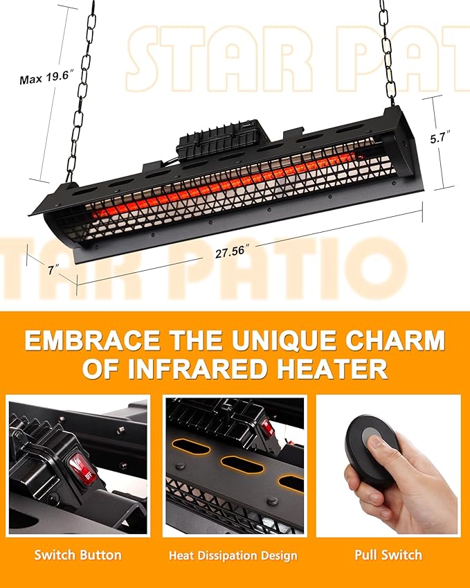 - STAR PATIO: YOUR OUTDOOR ELECTRIC PATIO HEATER EXPERT. Instantly provides a quiet warmth with simple power settings (1500W). Heats an area of up to 110 sq.ft.