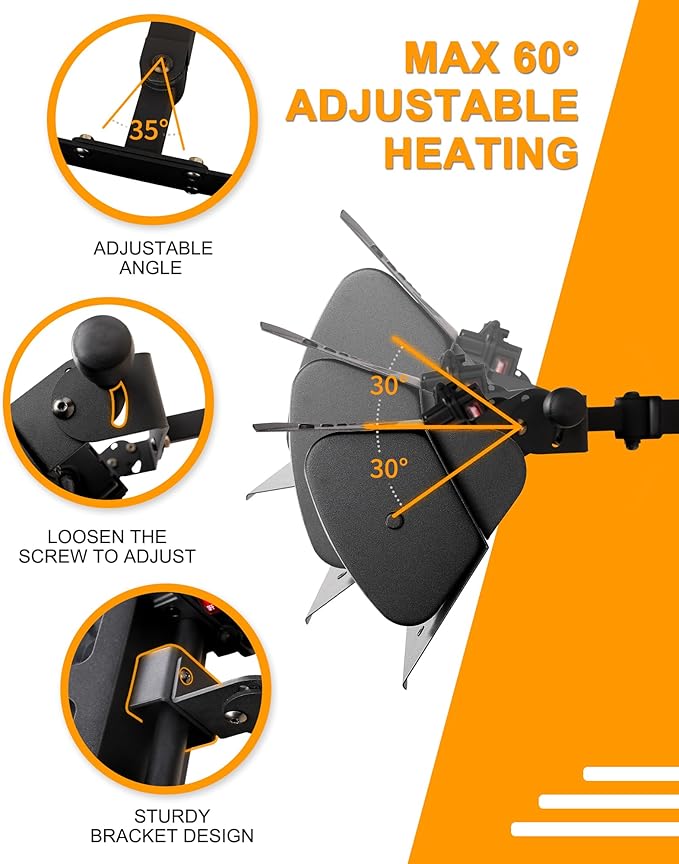 - VERSATILE WALL AND CEILING MOUNT OPTIONS. The patio heater comes with both ceiling chains and wall mounted bracket. Only 1 heater but provides multipurpose for hanging the heater or wall mounted! Loosen the two screws on the both sides of the bracket to easy adjust the veritical angle of heater (Maximum Angle of adjustment: 60 degree). The stylish industrial black design includes an aluminum casing and a stable articulated wall mount bracket.