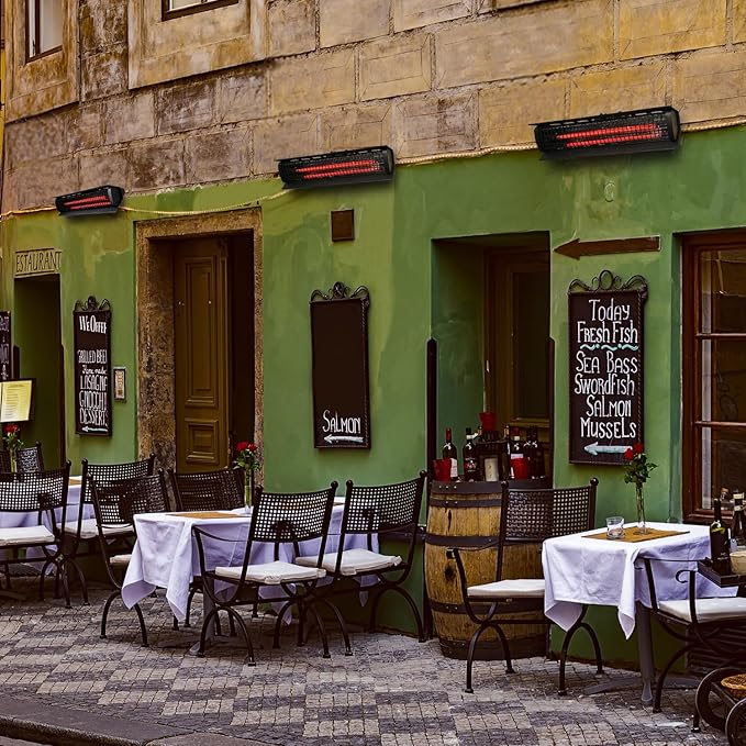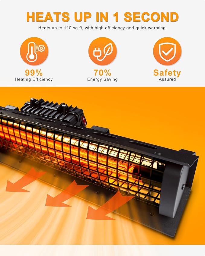 - OUR ELECTRIC PATIO HEATERS ARE OF PREMIUM QUALITY. This wall mounted ceiling electric patio heater produces 5100 BTUs of high-quality heat. The Golden Tube provides environmentally efficient heating with a lifespan of 5000 hours. This infrared heater is hardly affected by wind. ON-OFF Touch switch with remote control makes the electric wall mounted ceiling patio heater very user-friendly.