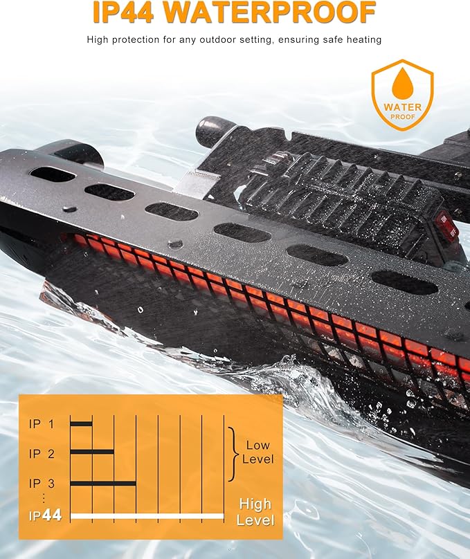 - CERTIFIED FOR QUALITY AND SAFETY: IP44 safety certified; weather and dust resistant for outdoor use. cSGSus certified. Outdoor patio heater producing no odors, chemicals, or fumes. For transportation safety, a remote battery is required but not included (2PCS x AAA 1.5V batteries).