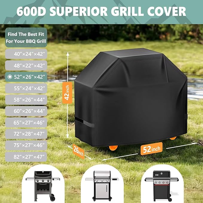 - [ Super Heavy-duty 52 Inch Grill Cover ] - Made of 600D premium oxford cloth with thickened soft coating, HomWanna BBQ grill covers are super durable but light weight. Measure: 52"W x 26"D x 42"H, this 52 inch grill cover is perfect to fit Weber Spirit 300 and Spirit 400 series grills, including: Spirit E-310, E-315, E-325, E-330, E-425, E-435 and more Weber Spirit 3/4 burners grills. Also fit 3 to 4 burners grills from Dyna-Glo, Nexgrill, Brinkmann and Monument with similar size.