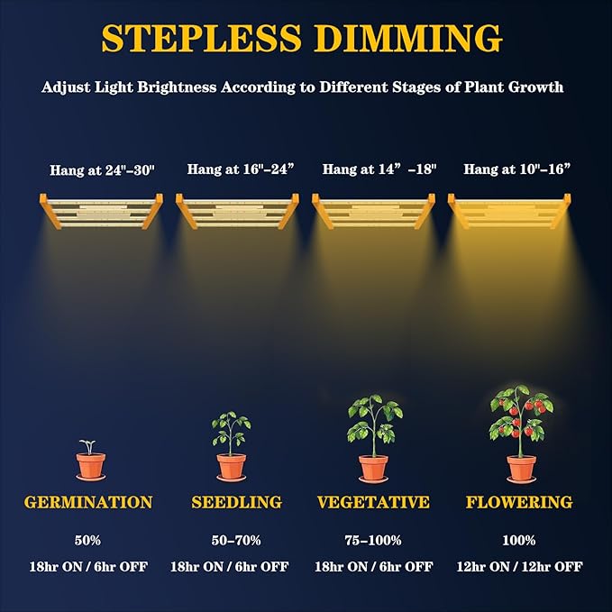 - 【STEPLESS DIMMABLE DESIGN】This hanging grow light designed with a dimming knob, you can adjust the brightness freely just as your plants growth stage, easily to operate. And this led growing lights with high energy efficiency, better light penetration. Ideal for hydroponic indoor seeding veg bloom greenhouse growing. Perfect for 2x2 ft tent.