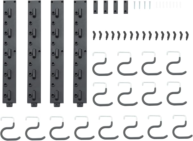 - Adjustable Hooks: The garden tool organizer for garage includes 20pcs adjustable s hooks and 16pcs peg hooks. Each hook is removable, you can customize the spacing between the attachments on the 64" steel rail (4 panels) to meet your needs. Each hook of tool organizer bears the weight up to 12LBS(5.44KG), each peg can bear the weight 5LBS(2.26KG).