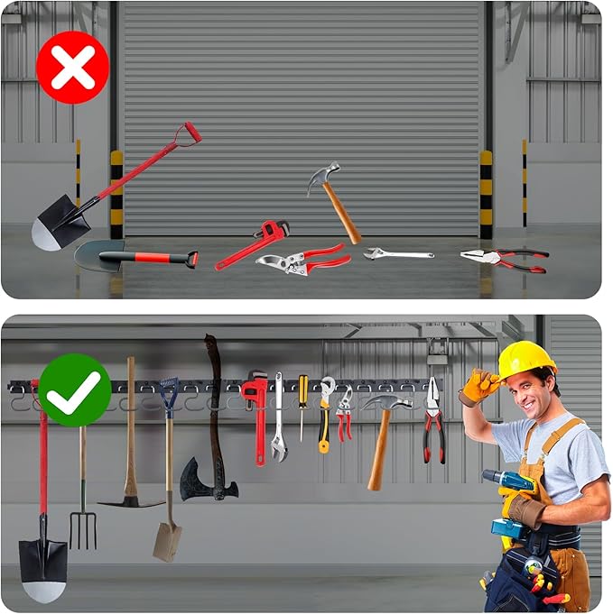 - Garage Tool Organizer: The 64 Inch garage wall mounted organizer can provide superb organization for home, garage, store, cellar. Perfect for hanging common tool such as garden tools, shovels rakes, brooms, mops, extension cords, hoses, power tools, and other sporting equipment such as helmets, boots, ice skates, hockey sticks, ski gears etc. A great solution to keep your space tidy and neat!