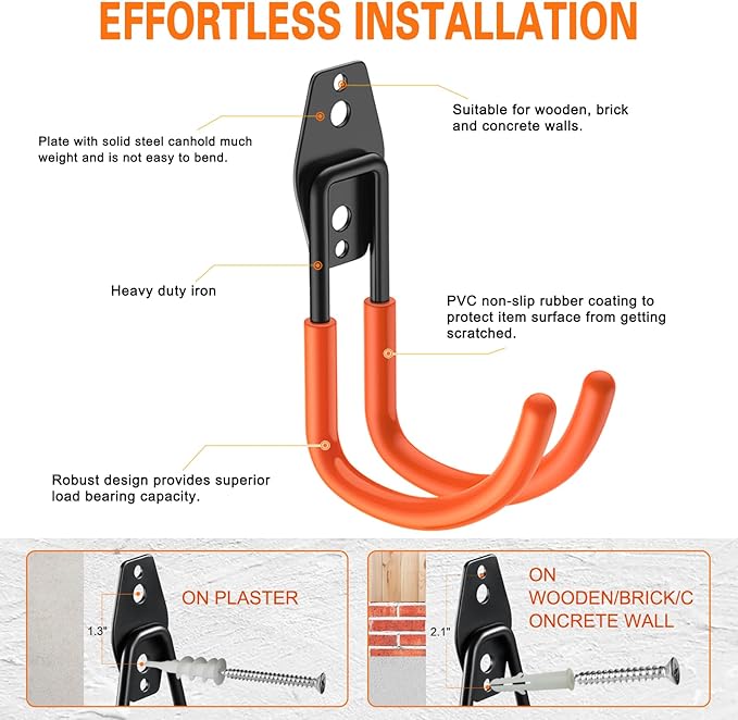 - Easy Installation: The garage hooks come with two types of screws, including 8 sets of screws and wall plugs, to accommodate different wall surfaces. Depending on your storage needs, you can install the garage wall hooks on brick/concrete/wood walls or drywall.