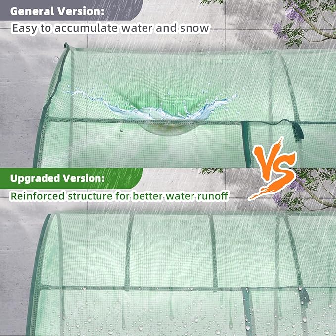 - Structural Upgrades: Made of durable metal frames coated with spray paint, the greenhouse structure is upgraded with additional 4 support bars at the top, increasing the weight-bearing capability. No more worries about snow or water-induced collapses