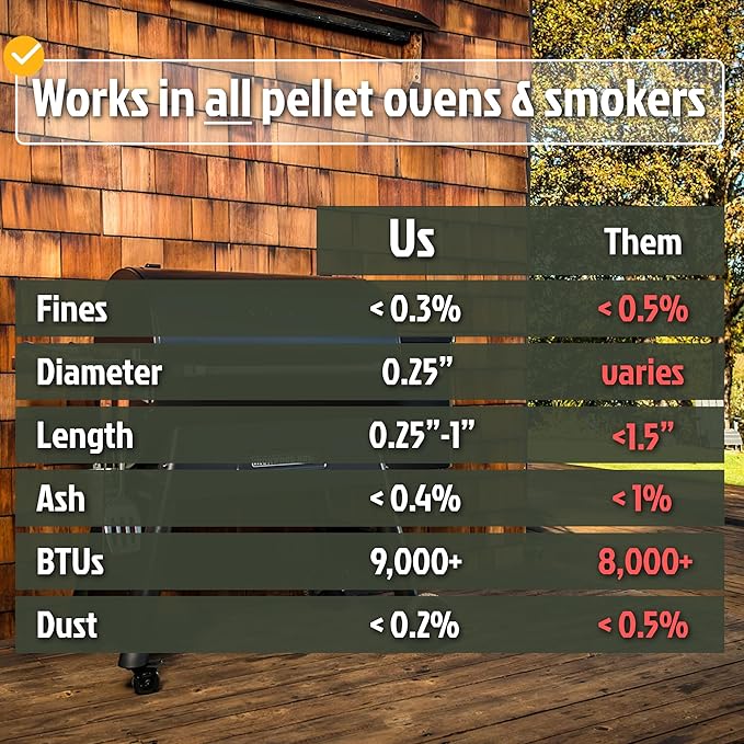 - Ultra Premium Performance – Our competition grade Gourmet Pellets put out about 9300 BTU's of heat. These are made from the same sawdust produced during the production of our Savory Blend 5" wood, pressed together with pressure and heat. We never use any Chemicals, Waxes, Binders or Fillers and promise an easy start.