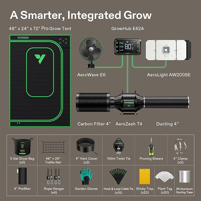 - Complete Plus Kit Included: 48"x24"x72" PRO Grow Tent; AeroLight AW200SE 200W LED Grow Light; AeroZesh T4 4" Duct Fan; AeroWave E6 Clip Fan; GrowHub E42A Controller; 4" Carbon Filter; 4" Prefilter; 4" 8ft Ducting; 4" Clamp×2; 48”×24” Trellis Net; 5 Gal Grow Bag×5; 4" Vent Cover×2; Pruning Shears; 100m Twist Tie; Sticky Trap×20; Plant Tag×20; Hook & Loop Cable Tie×10; 5ft Aluminum Ducting Tape; Garden Gloves; Rope Hanger×4