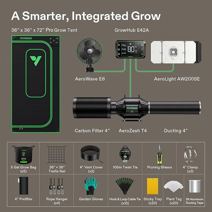 - Complete Plus Kit Included: 36"x36"x72" PRO Grow Tent; AeroLight AW200SE 200W LED Grow Light; AeroZesh T4 4" Duct Fan; AeroWave E6 Clip Fan; GrowHub E42A Controller; 4" Carbon Filter; 4" Prefilter; 4" 8ft Ducting; 4" Clamp×2; 36”×36” Trellis Net; 5 Gal Grow Bag×5; 4" Vent Cover×2; Pruning Shears; 100m Twist Tie; Sticky Trap×20; Plant Tag×20; Hook & Loop Cable Tie×10; 5ft Aluminum Ducting Tape; Garden Gloves; Rope Hanger×4