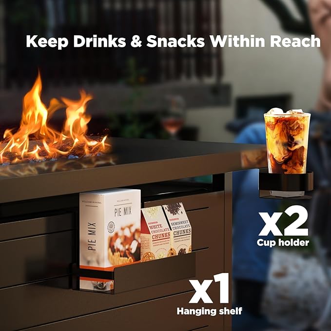 - Cup Holders & Storage Shelf: Utilize the two cup holders and detachable hanging shelf on the fire pit table to keep your drinks, snacks, and other essentials within easy reach. The cup holders connect on the corners underneath the tabletop edge to avoid direct exposure to heat.