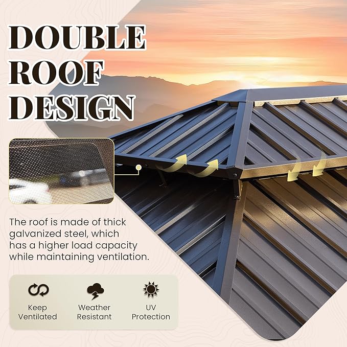 - GALVANIZED STEEL DOUBLE ROOF: This patio gazebo has a double-layer galvanized steel roof that offers great ventilation and airflow. Its sturdy construction provides protection against wind, rain, and snow, while the galvanized steel material ensures thermal insulation, waterproofing, and noise reduction.