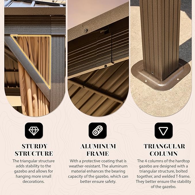 - ALUMINUM FRAME: Sturdy permanent hardtop gazebo built with triangular powder-coated aluminum frames, which are more stable and durable than the standard. The 12x18 gazebo with pre-drilled bases is designed for various kinds of ground and can be installed in different outdoor situations.