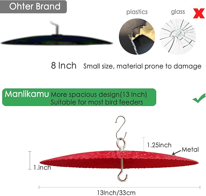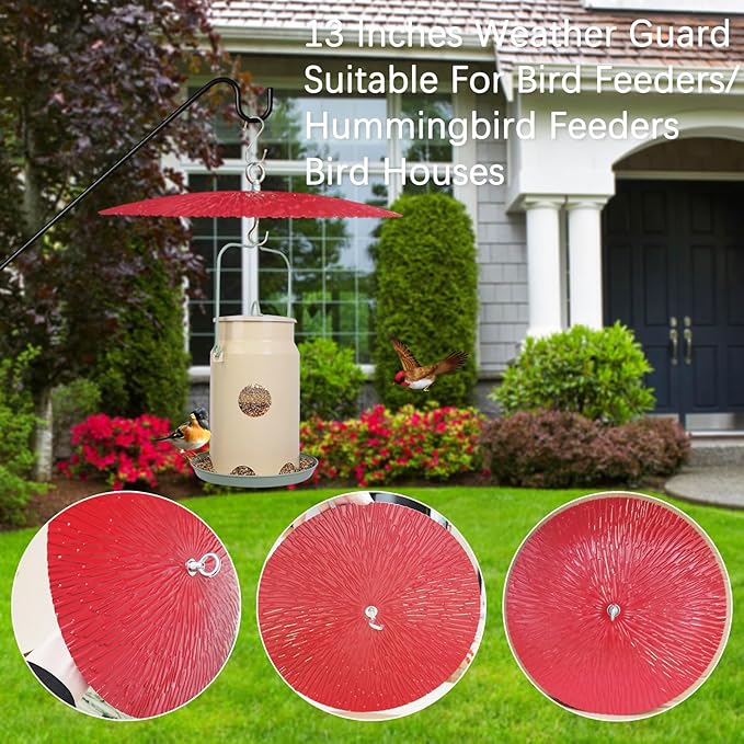 - 【Large Diameter】 The baffle has a diameter of 13inches, making it suitable for most bird feeders. It effectively prevents falling leaves and the erosion caused by wind and rain. It features a special curved shape to block rainwater during rainy weather or snowflakes during snowy conditions from entering the interior of the bird feeder.