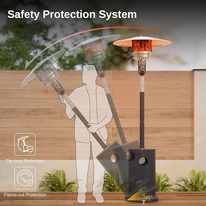 - ๐ฆ๐ฎ๐ณ๐ฒ๐๐ ๐ฃ๐ฟ๐ผ๐๐ฒ๐ฐ๐๐ถ๐ผ๐ป ๐ฆ๐๐๐๐ฒ๐บ: The Tip-over Protection system will shut off the flame when the patio heater propane is tilted more than 45 degrees. If the flame goes out, the Flame-out Protection system automatically shuts off the gas supply