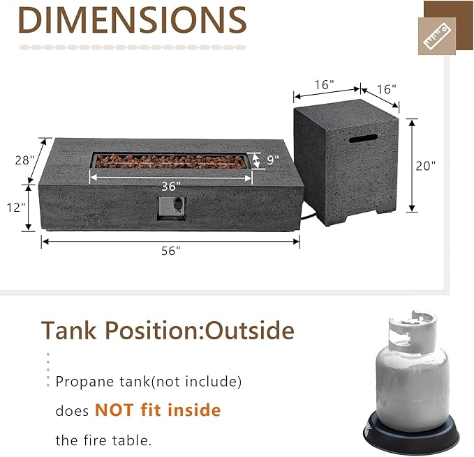 - đ„ăSpacial Economyă: Large enough coffee table surface to set your coffee or nightcap. The entire piece can easily be picked up from the side handles by two people. It fits a 20lb propane tank which should be put outside the fire table.