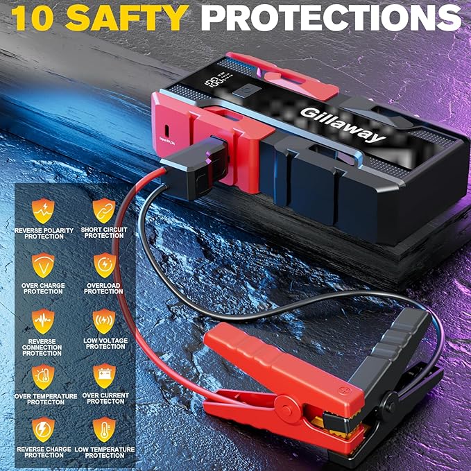 - The upgraded smart chip of the jump starter battery pack makes it easy and fast to start the car in extreme environments (-4°F to 140°F), with 8 built-in safety protection technologies.