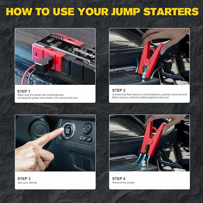 - [ULTRA EFFICIENT STARTERS ] Experience true control with our starter battery packs. Simply press the button to command the car to restart instantly. No need for outside help or expensive roadside service. Our starter puts the power back in your hands. It can also start trucks, motorcycles, snowmobiles, ATVs, UTVs, lawnmowers and even yachts in seconds.