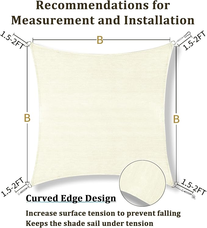 - Easy Installation and Maintenance: Measure and clean the installation area, leaving a 1.5-2 ft allowance between the fixing point and shade sail for hardware/ropes. Clean with mild detergent or water; avoid stiff brushes, washing machines, and clothes dryers
