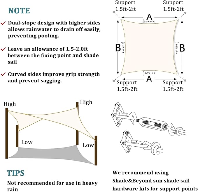 - Weather Precautions: Remove the shade sail during severe weather conditions for optimal maintenance. Allow for a tolerance of Β±6 inches per side, as shade cloth may shrink slightly