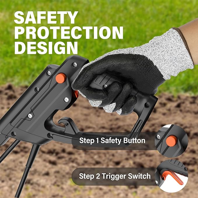 - [DOUBLE SAFETY PROTECTION] In order to ensure the safety of users, we have designed a double start button on this tiller, only when the safety button and trigger are pressed at the same time, the machine will start, preventing accidental injuries caused by accidental start, and also configured with overload protection. You can use our products with confidence.