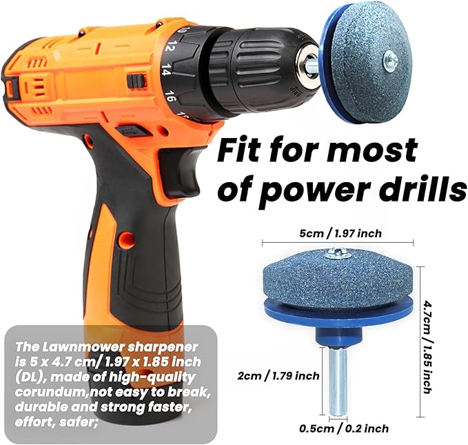 - LAWN MOWER SHARPENER: This Lawn Mower Sharpener is 50 x 47 mm/ 1.97 x 1.85 inch (DL), made of high-quality corundum,not easy to break, durable and strong faster, effort, safer, High quality stones sharpen blades in under 10 minutes so you will never spend time and effort on sharpening again;