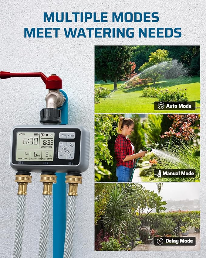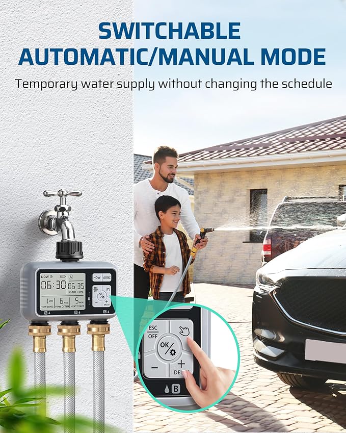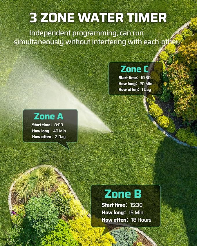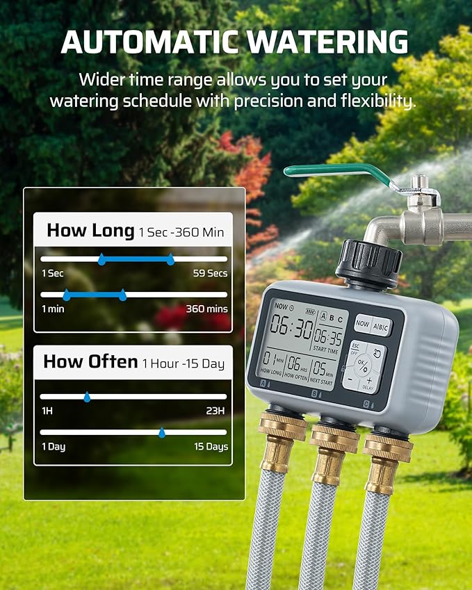 - [3 Independent Zones] Our faucet timer offers individual control over 3 zones (A, B, C), enabling tailored adjustments for start times, watering durations (1 second to 360 minutes), and watering frequencies (every 1 hour to 15 days); ensures optimal watering schedules for gardens, yards and lawns